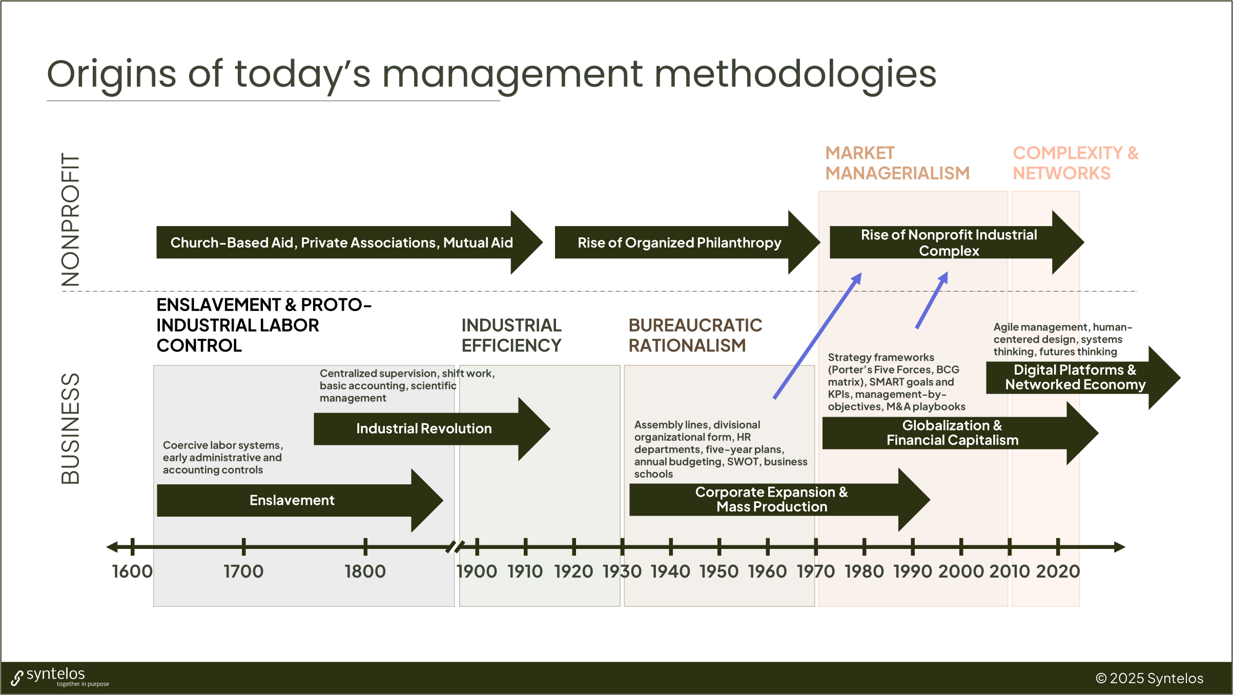 Earlier this month, I alluded to this perspective in a conference session in which I spoke to nonprofit leaders, board members, and funders about strategy for complex and uncertain times. The slide that sparked the most energy in the room described rough eras in the evolution of mainstream management approaches and how those mindsets and methodologies made their way into the social sector with the rise of the Nonprofit Industrial Complex (NPIC).