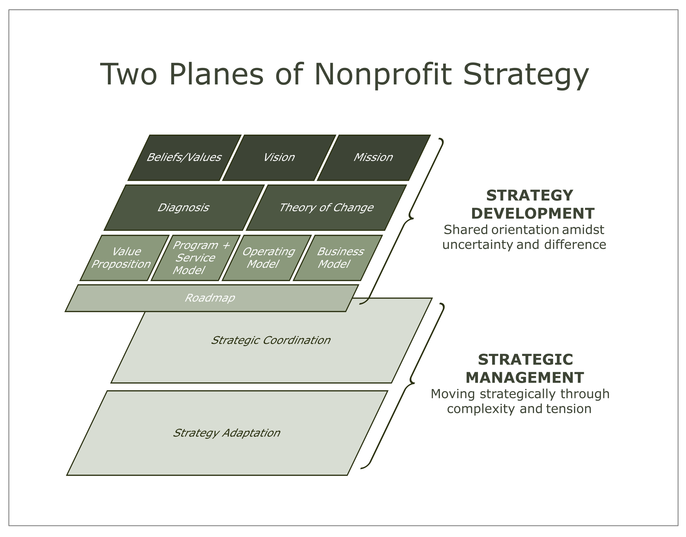 I have come to think of the two orientations as living in separate but entangled planes of organizational strategic life. One plane contains the “future-back” work of aligning on strategic intent amid uncertainty and difference. The other contains the “present-forward” work of moving strategically toward that intent through complexity and tension.